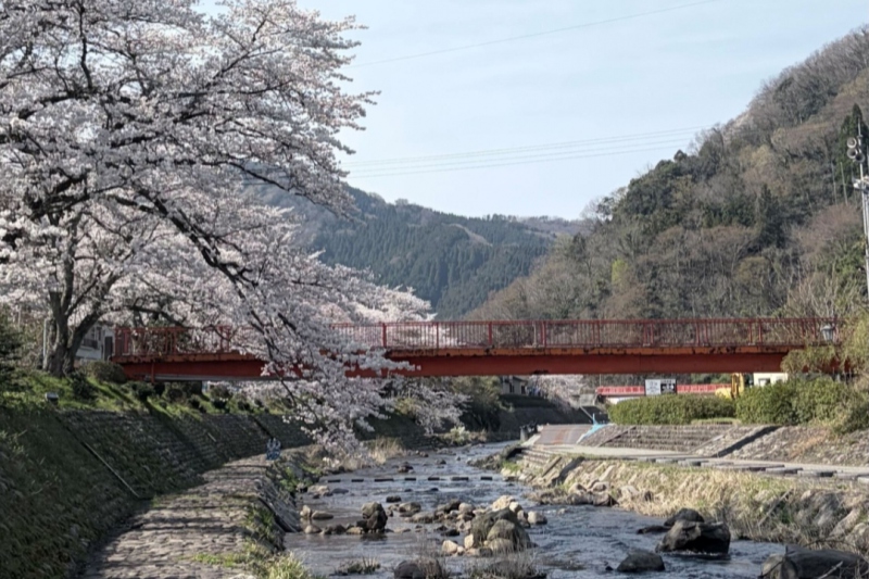 春来川沿いに位置する温泉半露天風呂付客室<かわみ>。専用の温泉半露天風呂の窓から下に目線を移すと、春来川が流れています。「温泉半露天風呂付き客室」とすることで、天候を気にせずに窓から春来川(はるきがわ)を眺めながら入浴できるようにいたしました。客室は2階にあり川に近く、川のせせらぎと、春には桜並木、夏には山々の緑、秋には紅葉、冬には雪景色といった四季をお愉しみいただけます。
