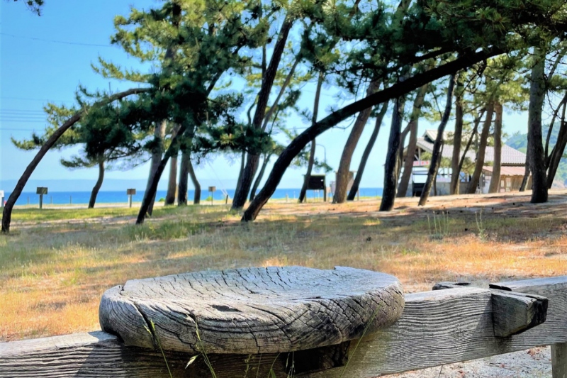 日本海を望む白い砂浜と松林のほかにも、駐車場、シャワー、トイレなどの設備も整っており、夏には海水浴やキャンプでにぎわいをみせます。