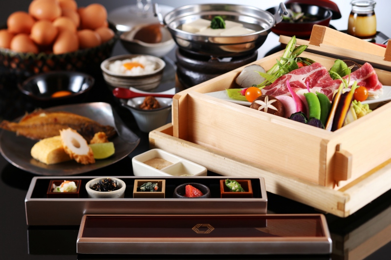 契約農家から仕入れた新鮮野菜や地元ブランド「八鹿豚」、浜坂名物の竹輪(ちくわ)などが愉しめるゆあむ名物「せいろ蒸し」、山陰産のお米を使用したホカホカのごはんと「但熊のこだわり卵」など、山陰の地産地消の“温かい”朝食は料理長のこだわり満載。