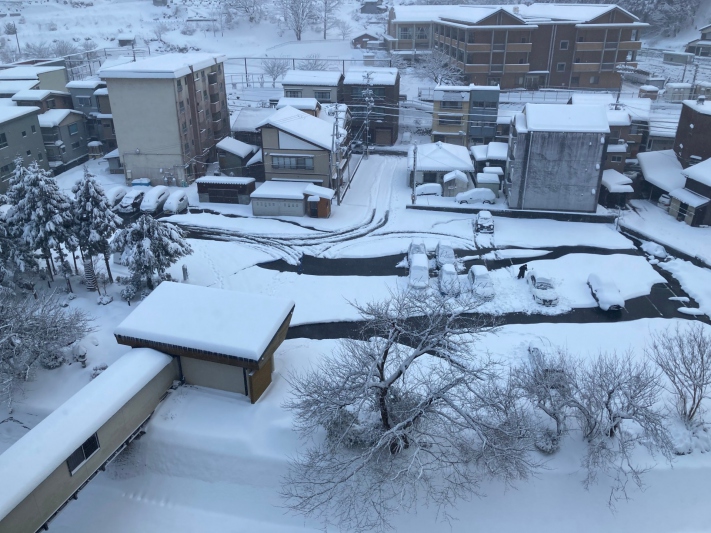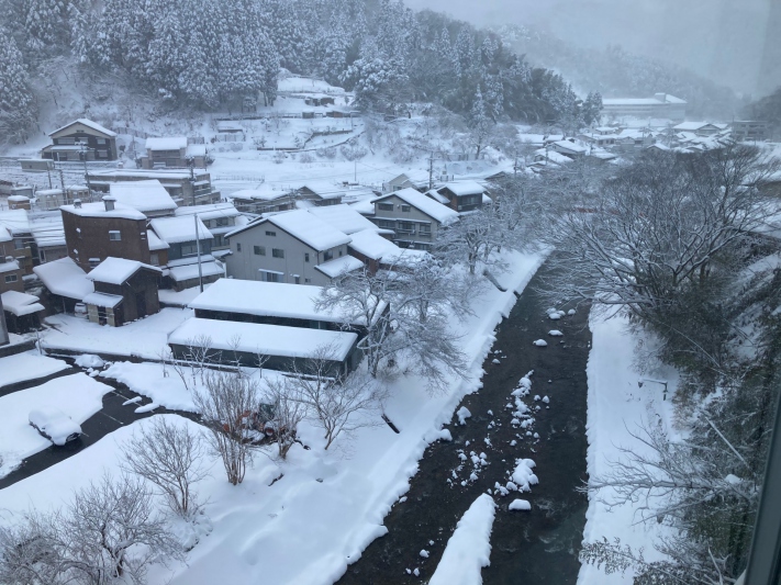 兵庫県/湯村温泉では暖かい日が続いてましたが、ここ数日は2月らしく冬に舞い戻りました。本日朝は雪が30cmほど積もりました。