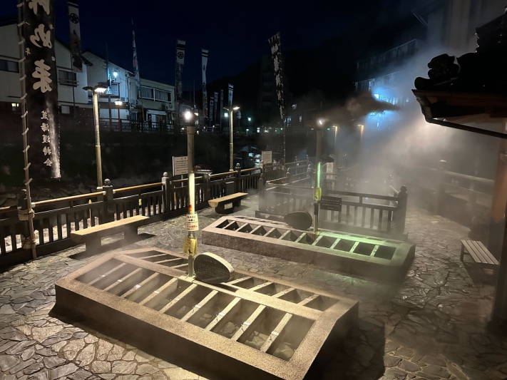 荒湯のすぐそば、春来川沿いに足湯が三か所設けられている「ふれあいの湯」。