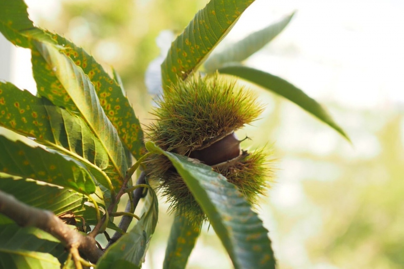 兵庫県北部/湯村温泉ゆあむ駐車場にて実る栗の実の景色をお届けいたします。