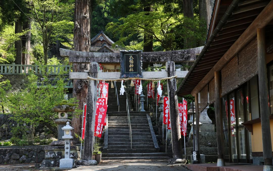 湯村温泉バスターミナル(全但バス)目の前の高台にある「八幡(はちまん)神社」は、京都・石清水八幡宮の但馬国/勝楽寺別宮として御奉祀された神社です。境内には日本三古塔の1つで、千年釜と呼ばれる特異な形の五輪の石塔や、樹齢数百年の古木で、縁結びや子宝に御利益があるとされる、御神木の「夫婦杉」などがあります。夫婦杉の奥にある神輿倉には、八坂神社の祭礼に使用されていた元禄11(1698)年製作の神輿などがあります。春には桜、秋には紅葉もお愉しみいただけます。