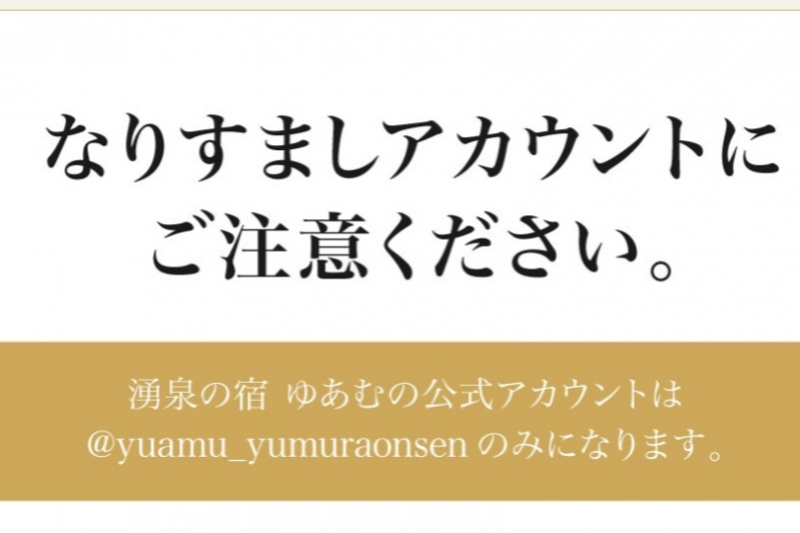 山陰湯村温泉湧泉の宿ゆあむ公式Instagramアカウントになりすました偽アカウントからの当選DMが確認されております。