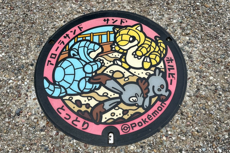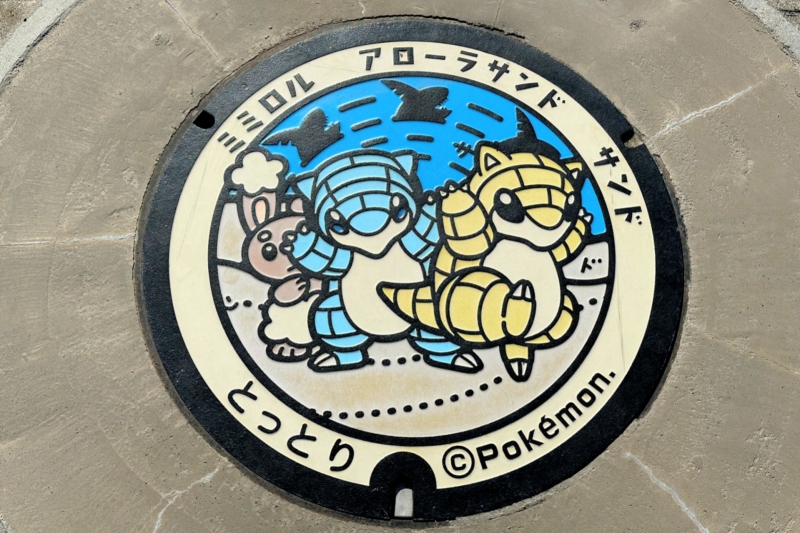 鳥取県/鳥取市の「鳥取砂丘 情報館 サンドパルとっとり」前に設置されたポケふたには、とっとりふるさと大使を務める「サンド」と「アローラサンド」、さらにうさぎポケモンの「ミミロル」が、鳥取砂丘に佇む姿で描かれています。