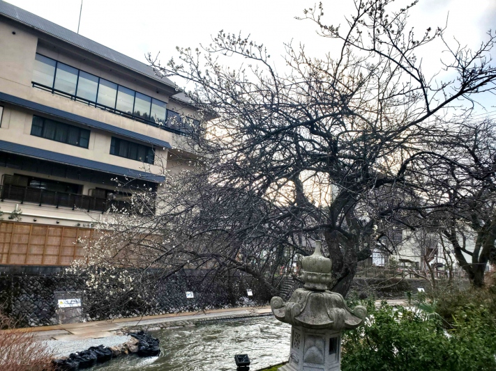 湯村温泉ではまだ木々は色づいておらず、冬のような景色が広がっていますが、春来川のほとりに咲く梅の花が、明るい気持ちにさせてくれます。