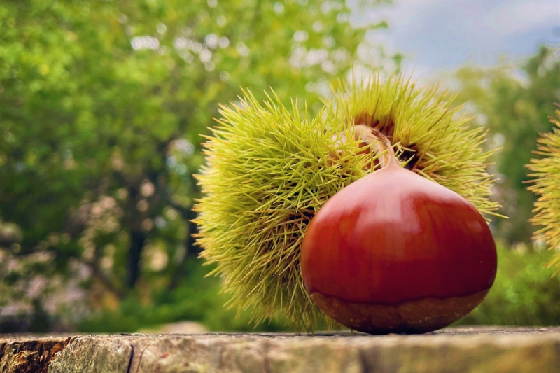 兵庫県北部/湯村温泉ゆあむ駐車場にて実る栗の実の景色をお届けいたします。